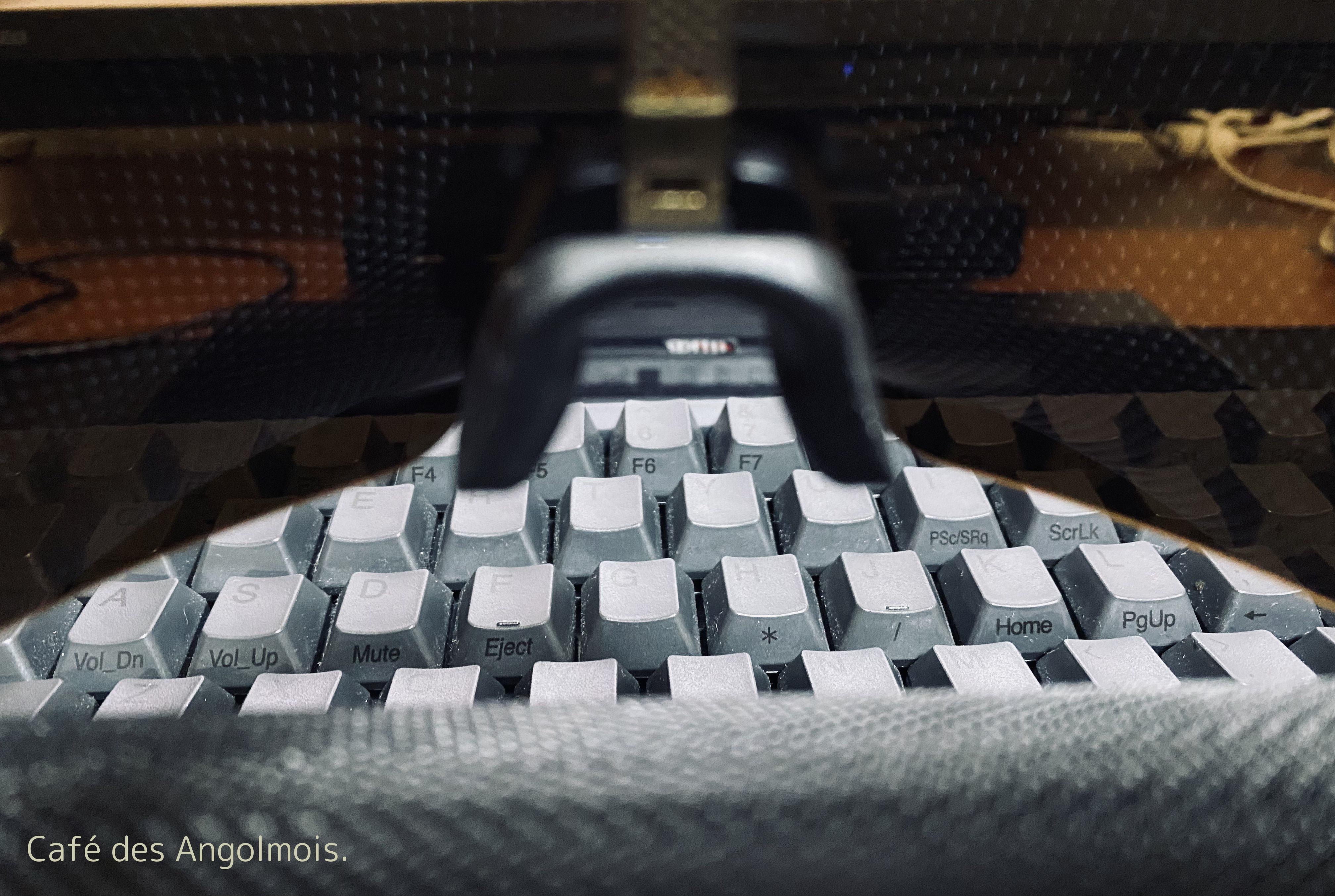 デスクは足場がなく透明で広い。目の前には変幻自在な複数のモニタ-。なにかプログラミングをしているようだ。 キーボードはやはりPFUの『HHKB HYBRID TYPE-S』。 デスクの端にはPRでは既に失われてしまったYAMAHAの『RBX-6JM』が立てかけてあるが、宙に浮いているように見える。買いなおしたのだろうか。
