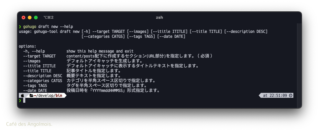 > gohugo draft new --target design_hugo_post_flow_command --date 202302122350 --tags "hugo development blog hopstepgohugo python" --categories "雑記" --title "Python argparseでHugo投稿用のコマンドセットを作る. [Vol.1] 要件編" --description "新記事作成時の要件。"
